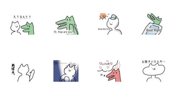 猫(?)とワニ(?)のスタンプ。毎日使えると思うよ!待って、彼らは動物なの?!二足歩行してるよ?!
