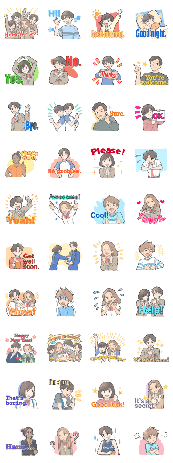 | スタンプ説明 | 光村図書中学校英語教科書『Here We Go!』に登場するキャラクターのスタンプです。(イラスト:やぼみ) |