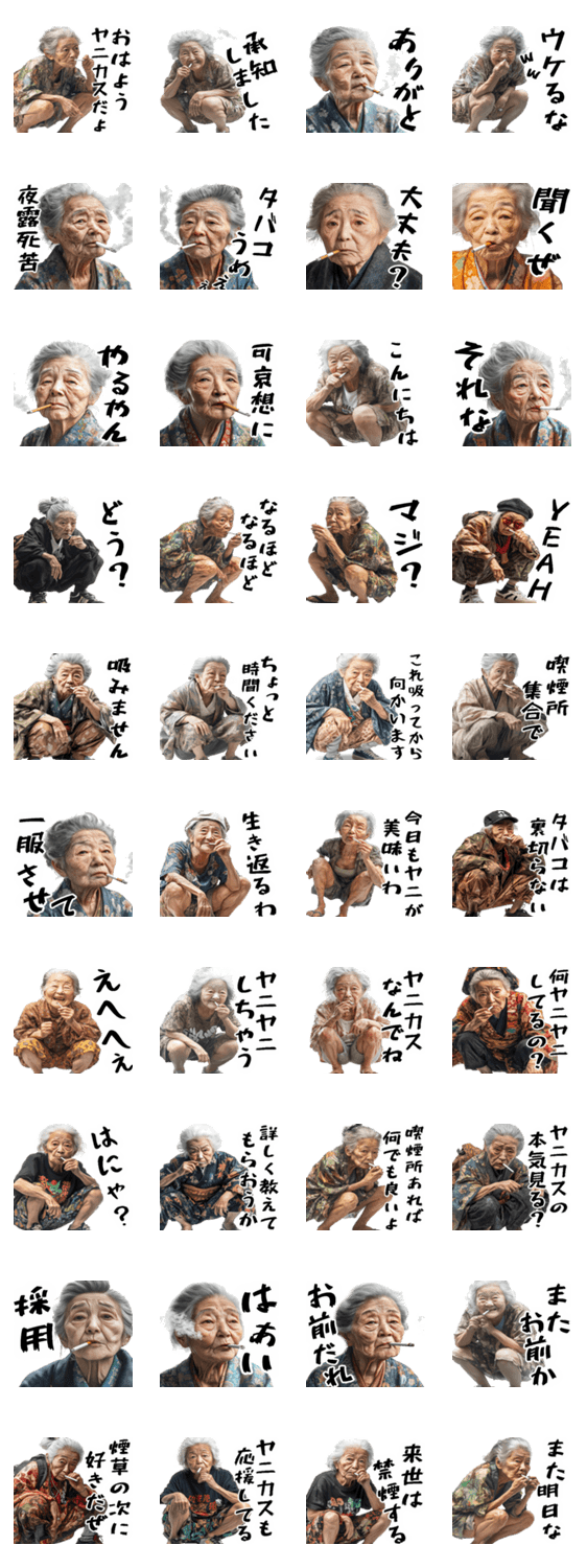 | スタンプ説明 | 毎日超便利なババァの煙草スタンプ/使いやすい/おもしろ/面白い/ネタ/老人/たばこタバコ/ギャグ/挨拶/AI/ウザい/日常会話/爆笑/婆さん/楽しい/好き/メンヘラ/友達/煽り悪口 |
