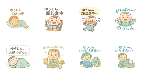 | スタンプ説明 | ねんね中、離乳食中、いたずら中…赤ちゃんゆうしんの育児あるあるスタンプ。育児中のママやパパ、じいじ・ばあば・赤ちゃん好きにおすすめ! |