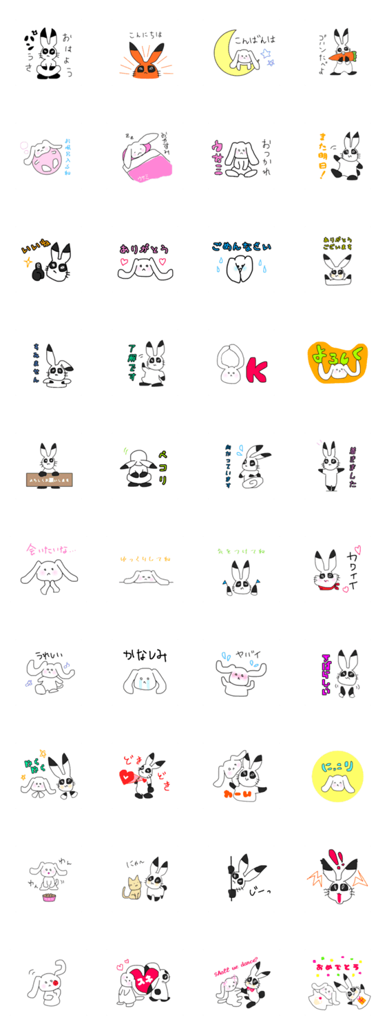 オリジナルキャラクターのパンうさ&ウサミのスタンプです。パンうさはパンダみたいなウサギ、ウサミはウサギみたいなワンコ。2匹はいつも一緒でめっちゃ仲良し!