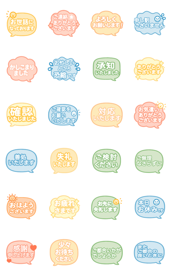 仕事で使いやすい丁寧語だけの文字スタンプ。 やわらかい手書き風フォントとパステルカラーで、上司や同僚にも送りやすいデザインです。