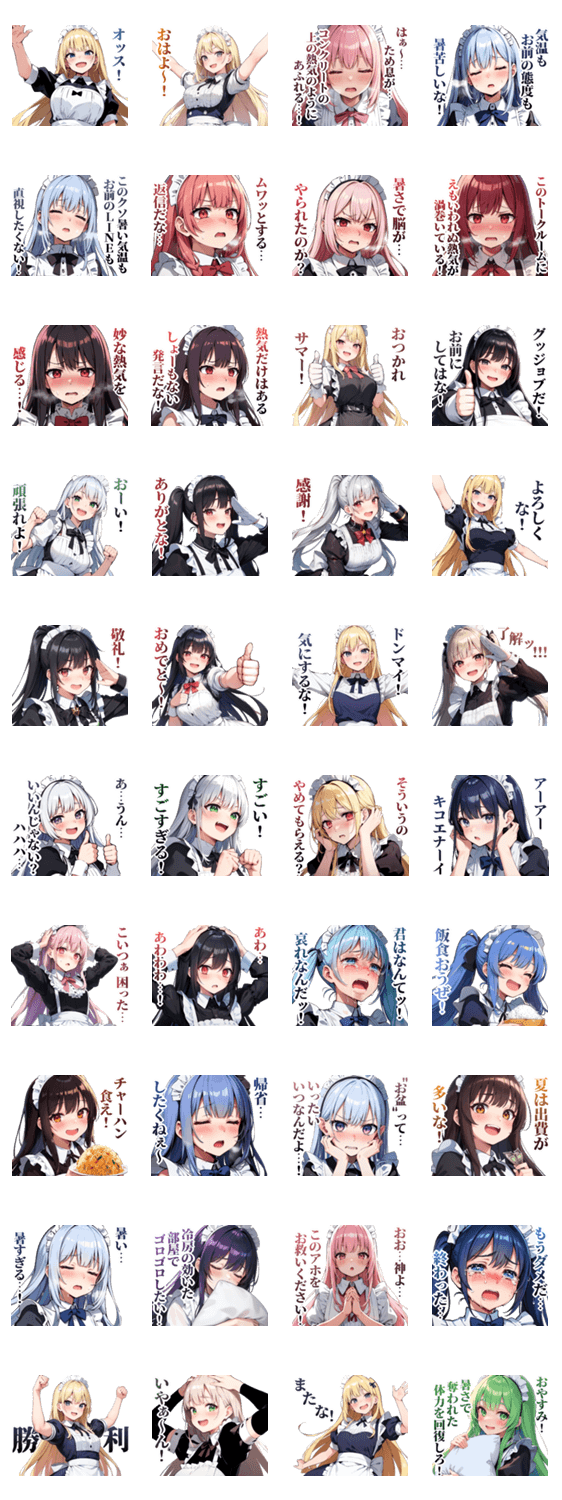 なんかウザいメイドさんの夏に使えるスタンプです。夏以外にも年中使えます。熱中症には注意。真夏日、お盆、帰省、汗、かわいい、メイドカフェ、萌え、美少女、コスプレ。