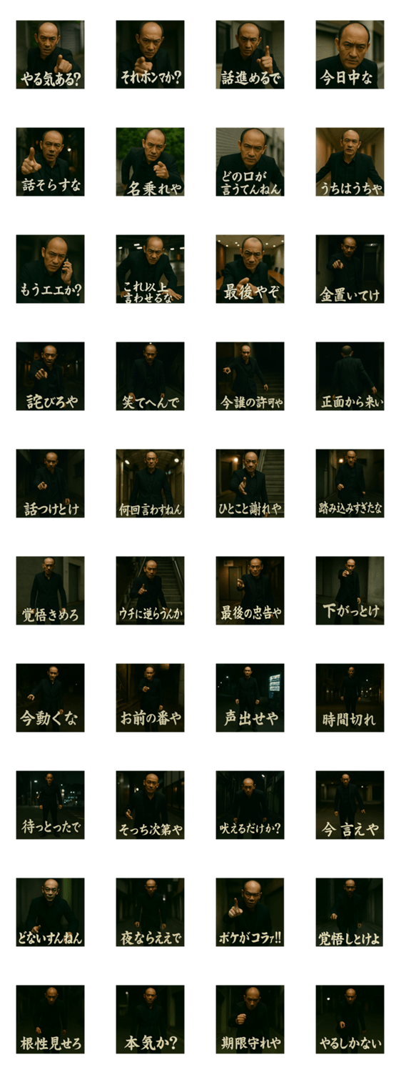 リアルすぎる“闇金の人”が、冷たい街角から放つ圧。 日常のやりとりも一発で詰めに変わる、全身全霊スタンプ。