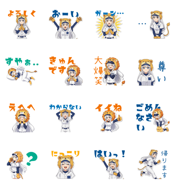 獅子っ娘のスタンプです。野球が好きで自慢の立髪ライオンずきんを被って今日も元気に応援します。野球/猫/獅子党/鷹/鷲/虎党/埼玉/れおほー/プロ野球