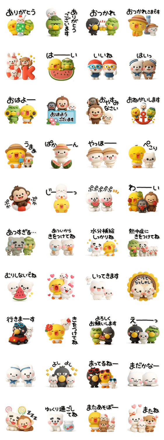 | スタンプ説明 | いろんなキャラクターたちが大集合した特別な夏スタンプです。ずっと使える内容を揃えましたのでスタンプ初心者の方にもオススメです。 |