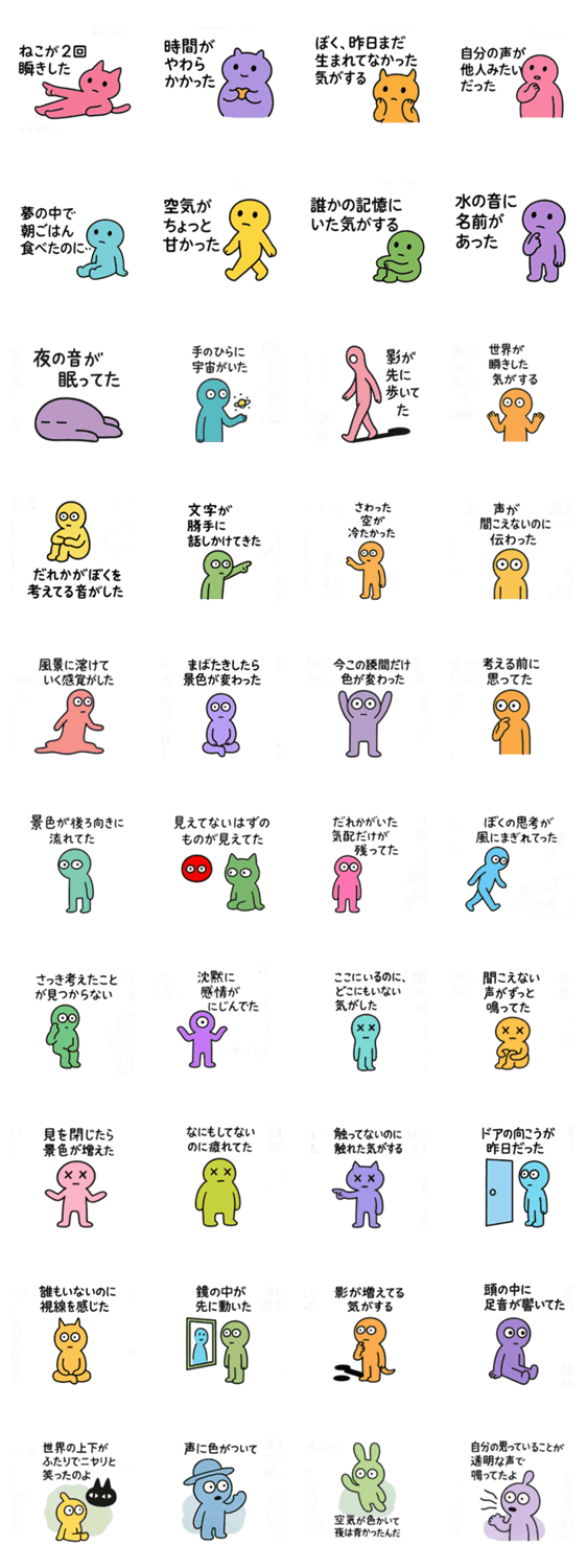 | スタンプ説明 | 哲学・無機質・不思議・病みかわ・感情・共感・ゆるかわ。わかるけど説明できない感覚を、カラフルで個性的なキャラが代弁。意味深で使いやすいセリフ系スタンプ! |