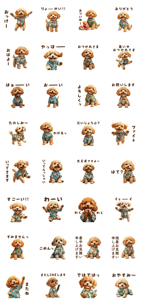 夏にぴったりのアロハシャツ姿の子犬トイプードルスタンプ!普段使いの言葉から夏のご挨拶まで気軽なメッセージにも使える!