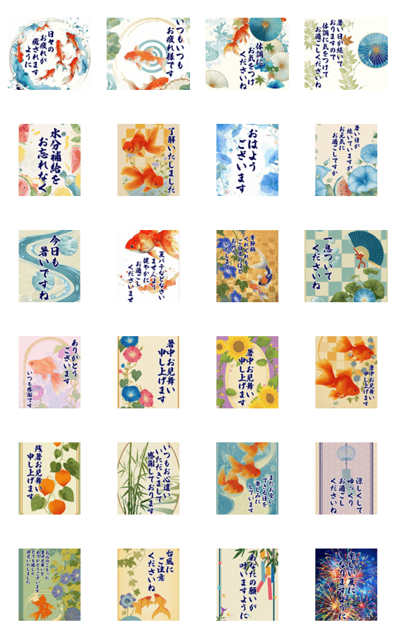 夏の日常の挨拶や長文のご挨拶暑中見舞いまで日本の夏をぎゅっと詰め込んだ豪華セットです。金魚花火などの和と涼や心遣いを感じられます。健やかな夏をお過ごしください。