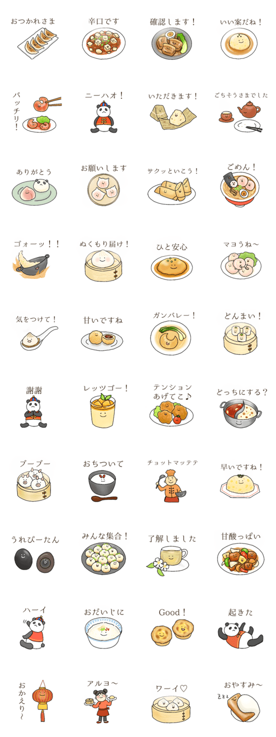 みんな大好き中華料理!小籠包、麻婆豆腐、点心、ラーメン、エビマヨ⋯ かわいい中華料理たちがあなたの気持ちを伝えます!ときどきパンダも登場