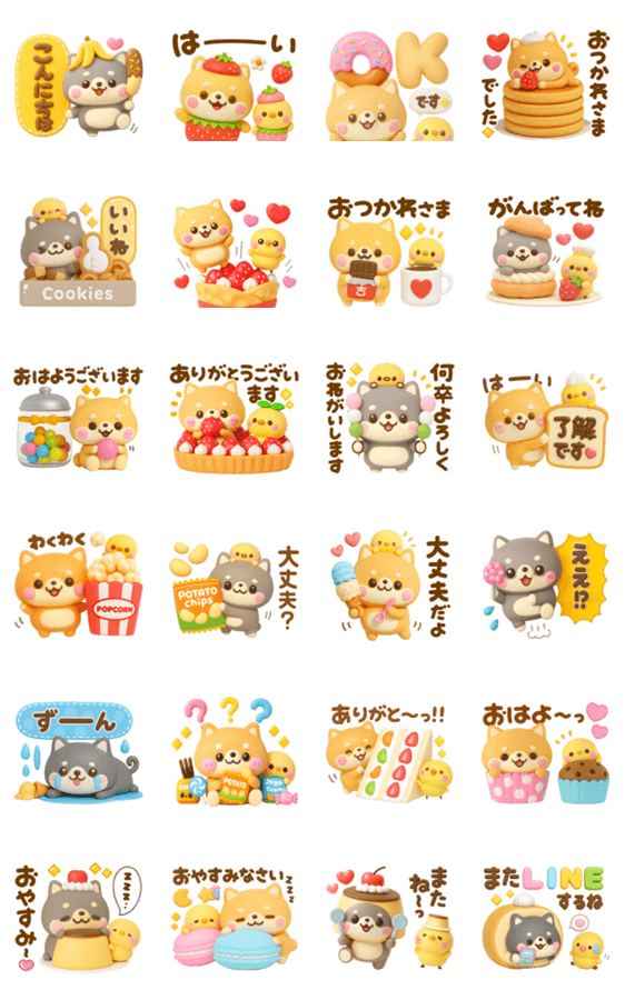 美味しそうなスイーツいっぱい!毎日使えるあいさつ言葉が揃ったかわいい柴犬の立体スタンプです。