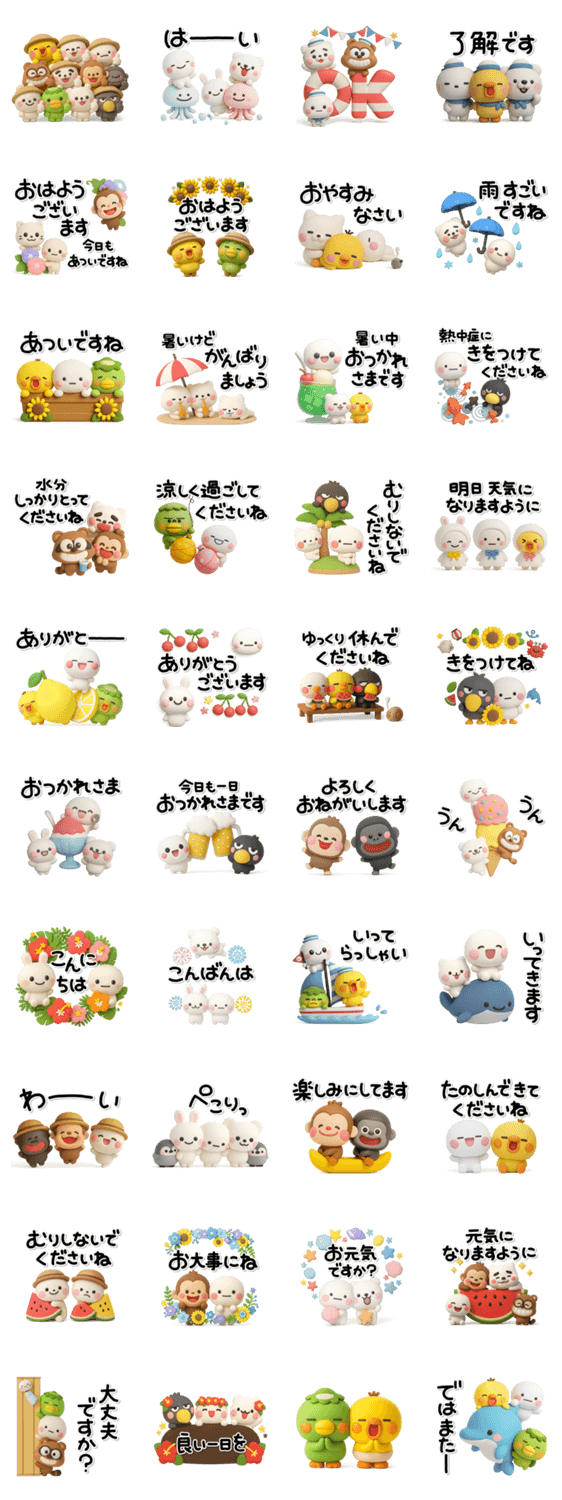 | スタンプ説明 | たくさんのキャラ大集合の夏作品です。全体的に落ち着いた色合いですので大人の方にもピッタリです。使いやすい内容を厳選していますので初心者の方にもオススメです。 |