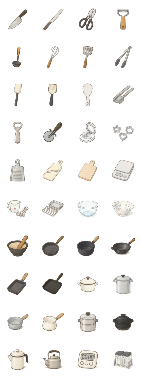 | スタンプ説明 | 料理中や食卓でのやりとりにぴったり!シンプルでおしゃれなキッチングッズのスタンプ。かわいい道具たちが毎日の暮らしにそっと寄り添います。鍋、フライパン、などなど。 |