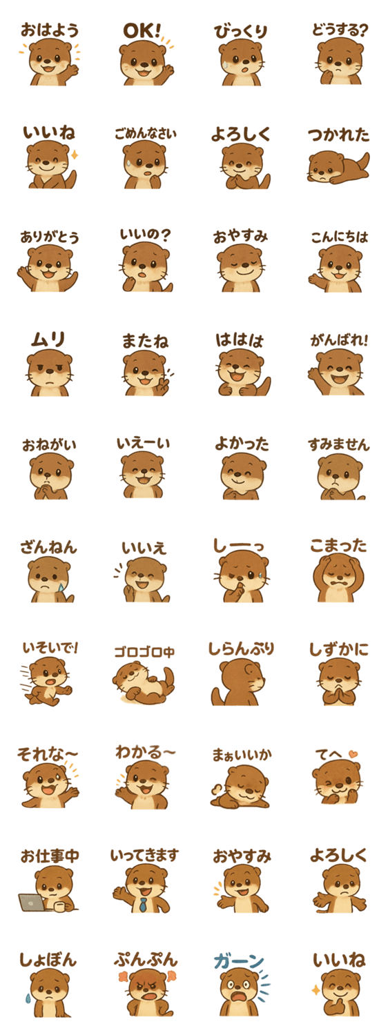 がんばるあなたを応援する、やさしいコツメカワウソスタンプ。ゆるキャラ好きな人にぴったりの癒し系スタンプです。