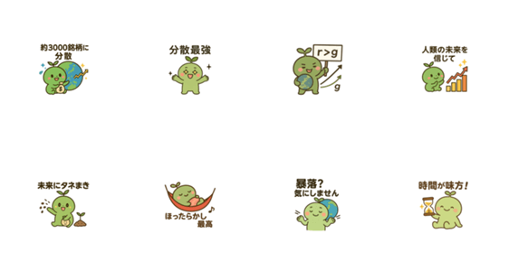 | スタンプ説明 | nde-kun, the chill sprout investor! Share your love for global diversification and calm, long-term investing with these cute and fun stickers! |