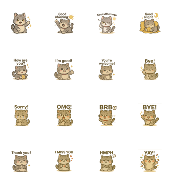 | スタンプ説明 | A cute, chubby grey British Shorthair cat with golden anime-style eyes and a collar. |