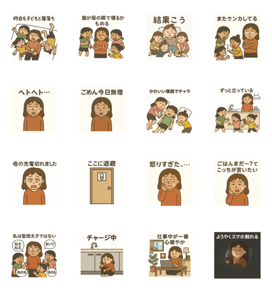 10歳・7歳・4歳の三姉妹に振り回される毎日。寝かしつけで寝落ち、ケンカの仲裁、トイレに避難…母の叫びと笑いを詰め込んだ、育児カオスな日常スタンプです。