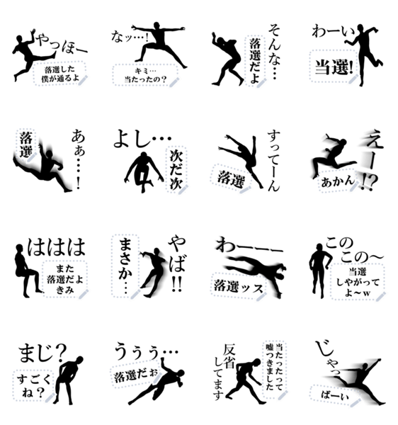 枠内に文字入力できる★人間のシルエット×活字でシンプル!見やすい!でか文字メッセージスタンプ 当選落選も報告! 面白ネタ系/コミック風/ヒト型/ジョーク/リアクション 現在この商品は一部のスマートフォン版LINE 10.3.0以上のトークルームでのみ使用できます。動作環境の最新情報はヘルプをご確認ください。