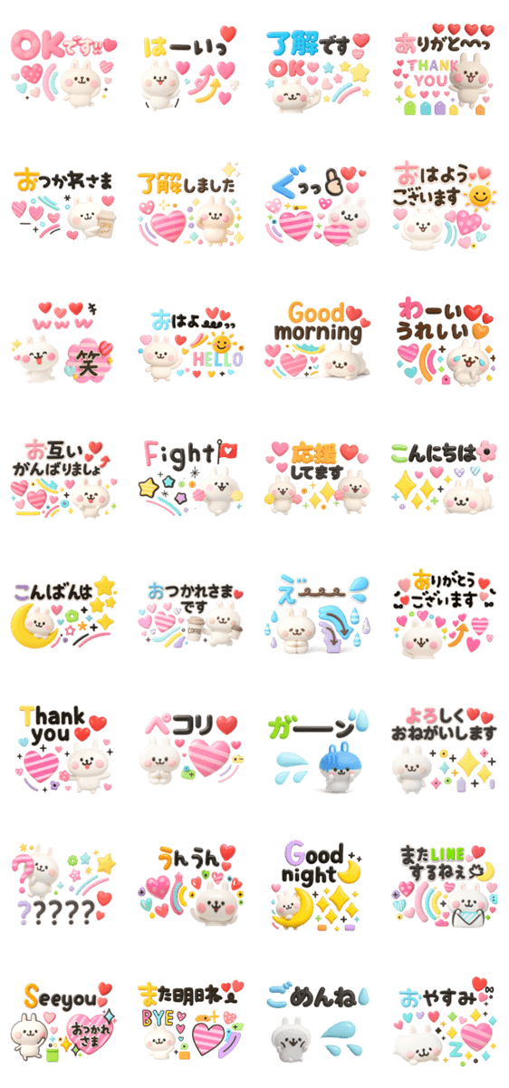 カラフルうさぎの立体スタンプ♡みんな使える無難な日常会話セットです。 かわいい/家族/カップル/大人可愛い/ポップ/ガーリー/どうぶつ