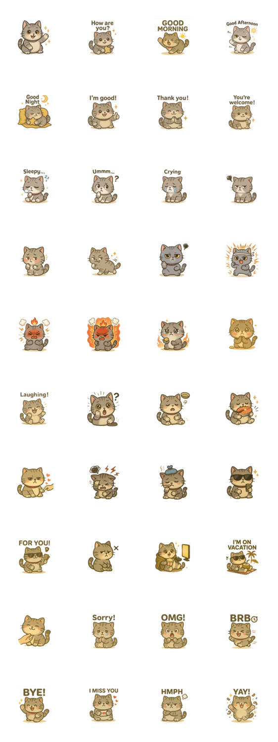 | スタンプ説明 | A cute, chubby grey British Shorthair cat with golden anime-style eyes and a collar. |