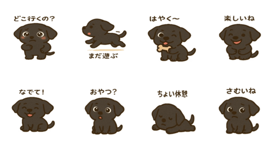 | スタンプ説明 | ゆる〜く気持ちを伝える黒いラブラドールのスタンプです。さみしい日も楽しい日も、一緒に気持ちを届けてくれるよ! |