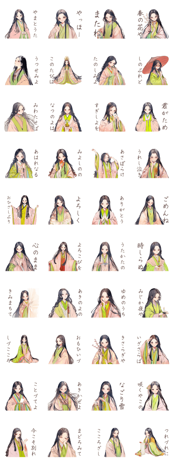 平安時代の優雅な着物美人。和風、古典、貴族、かわいい女性、和歌、伝統スタンプ。