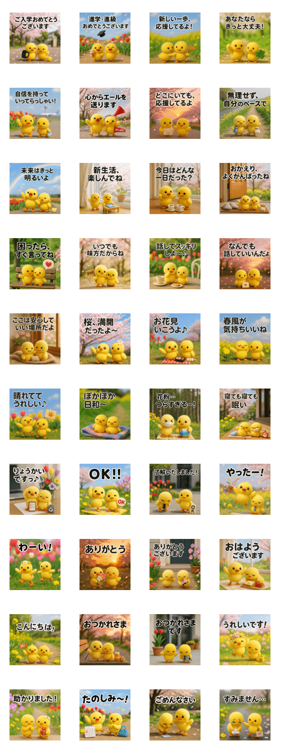 | スタンプ説明 | 癒しのフェルトひよこが4月のごあいさつや日常トークをお届け♪4月の季節感や進学・新生活の雰囲気をまるごと詰めこんだ、ぬくもりいっぱいの癒し系ひよこスタンプ。 |