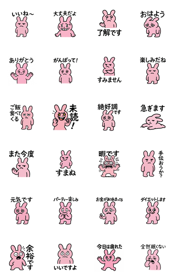 現代人の「言えない本音」を表情で表現!ピンクのうさぎが建前と本音のギャップを可愛く代弁。「大丈夫だよ」と言いながら困った顔など、思わず使いたくなるスタンプ24個