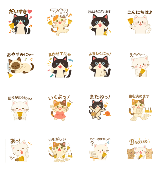 | スタンプ説明 | かわいい猫がハンドベルで気持ちを伝える♪ 挨拶からリアクションまで、音楽好きにも猫好きにもぴったりの日常スタンプです! |