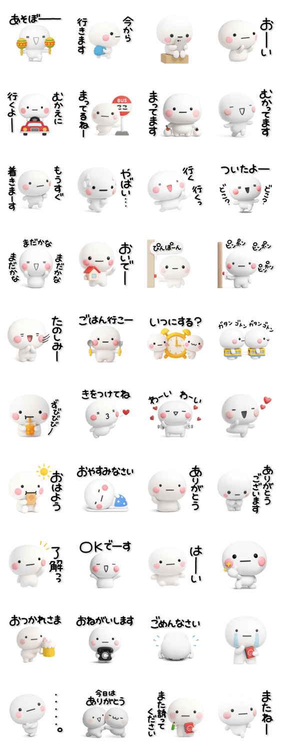 | スタンプ説明 | しろくてまるい子たちのお誘いスタンプです。ずっと使える内容を揃えましたのでスタンプ初心者の方にもオススメです。 |