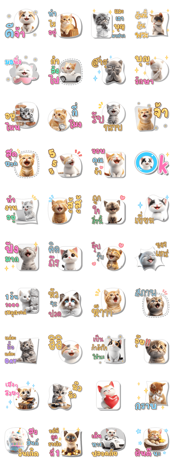 | スタンプ説明 | Cute cat greetings, 3D, Big text, Persian, Scottish fold, American shorthair, British Shorthair, Siamese, white orange cat , bubbles text Pastel colors. |