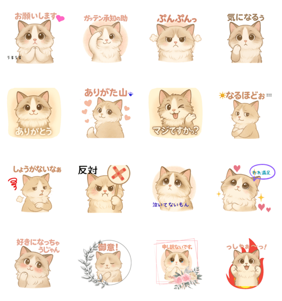 | スタンプ説明 | うるうるお目目のラグドールねこが、日常の気持ちをほんわか伝えてくれるスタンプです。お願いからプンプンまで癒しの一言がきっと届く♪ |