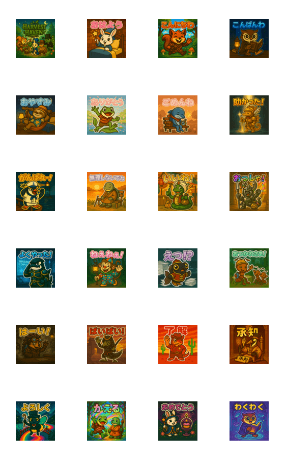 | スタンプ説明 | ハーヴェストヘイヴン:自然とファンタジーが融合する世界から、個性豊かなキャラクターたちがLINEスタンプで登場!トークを楽しく彩る一押しのセットです |