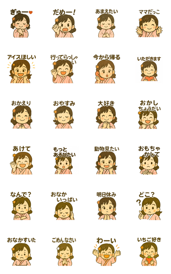 きもの姿の可愛い女の子が「おなかすいた」「アイスほしい」「おかえり」など、子どもが日常で言いそうな言葉を可愛く伝えるLINEスタンプです。