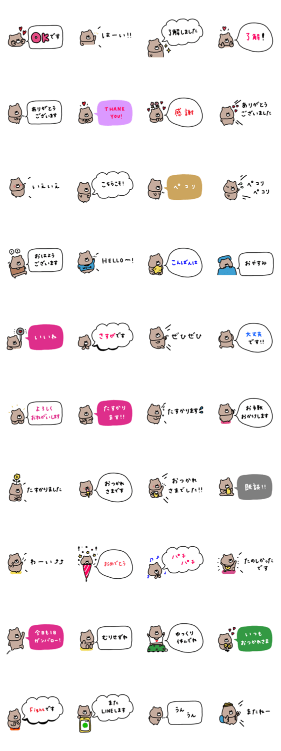 | スタンプ説明 | 優しいお色のクマ。省スペースで使いやすい。かわいい吹き出し付き。 |