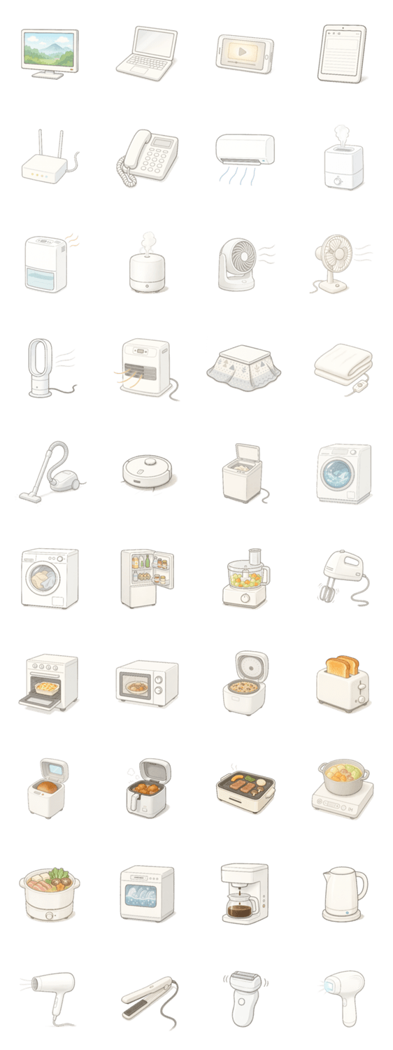 | スタンプ説明 | 電話やWiFiルーター、スマホからおしゃれな家電まで、暮らしを支える電化製品がシンプルな手描き風デザインで大集合! |