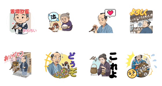 スタンプ説明 昔ばなしの舌切り雀の可愛いスタンプです