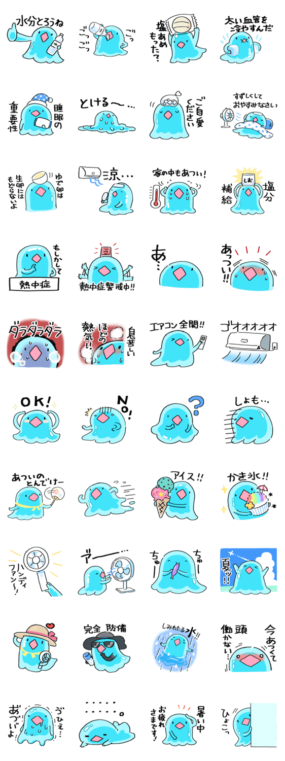 猛暑や熱中症を気づかう優しく涼やかなスライムのスタンプです。