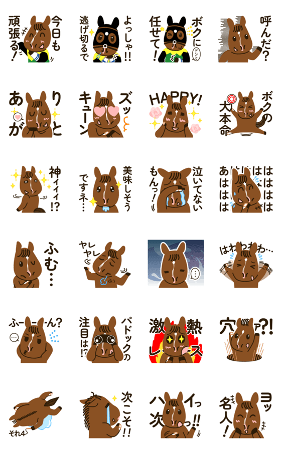 | スタンプ説明 | 日本の元競走馬、タイトルホルダーのスタンプ。日常会話を可愛く楽しくしてくれます。競馬好き同士で楽しく使ってくださいね♪馬主様より肖像権使用許諾取得しました。 |