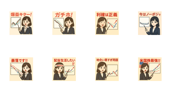 投資女子の気持ちを代弁するスタンプ登場!「爆益キター!」「ガチホ!」「暴落です!!」など、相場のリアルな心の声をLINEで伝えよう。