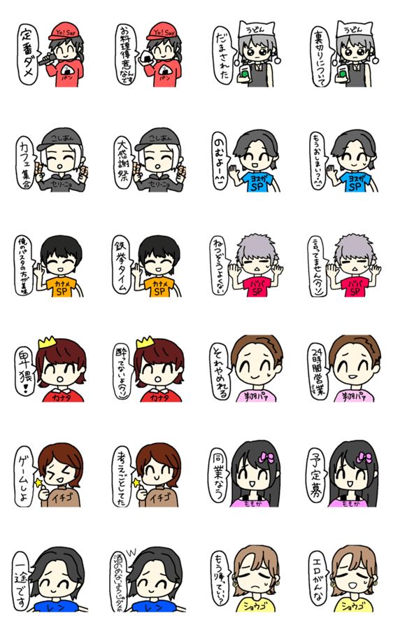 | スタンプ説明 | 全員のホンカノです。嘘です。痛客視点で作りました。 最近は揚げ物させてくれるバーを探しています |