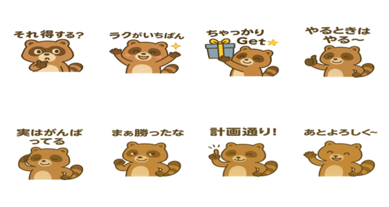 | スタンプ説明 | 要領よく生きる、ちゃっかりタヌキのスタンプです。日常の会話に使いやすい、ちょっと得するひと言たち! |