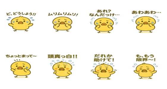 | スタンプ説明 | ちょっとしたことでテンパっちゃうヒヨコのスタンプ。焦ってるとき、困ったときにピッタリ! |