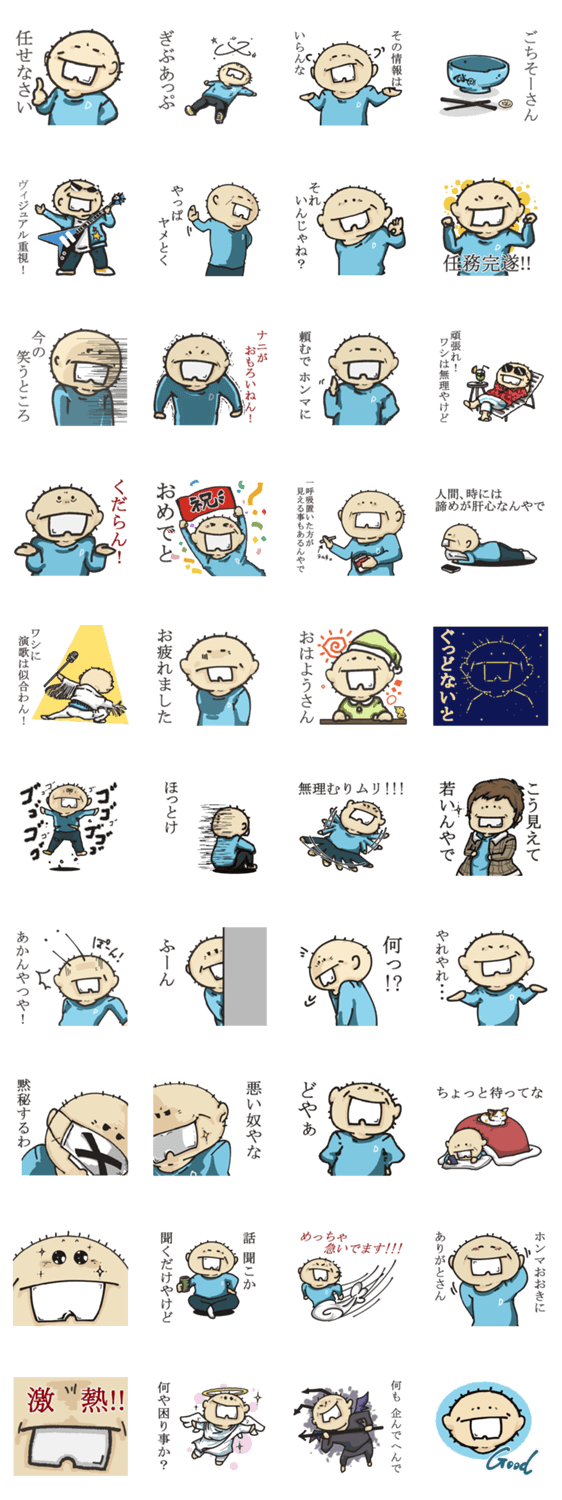 | スタンプ説明 | 彼の名前は『でばおやじ』です。出っ歯のオヤジです。父のオリジナルキャラクターを娘が描いたコラボ作品です。時には渋め、時にはロックで若い、それがでばおやじ! |