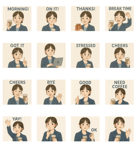 | スタンプ説明 | Anna is a office lady and need coffee every morning before working. |