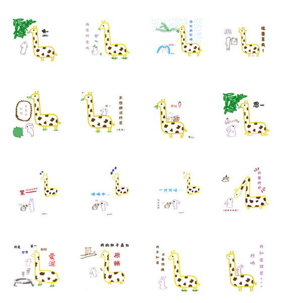 | スタンプ説明 | A grumpy bunny and a chill giraffe navigating drama, hugs, and chaos with lots of love and laughs! |