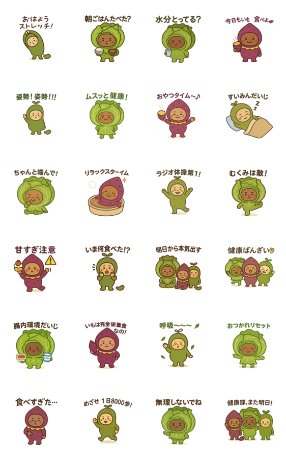 ムス顔キャベ子、いも愛強めのさつまいも子、元気印のまめ子が、あなたの健康生活をゆる〜く応援!毎日使える癒し系スタンプです。