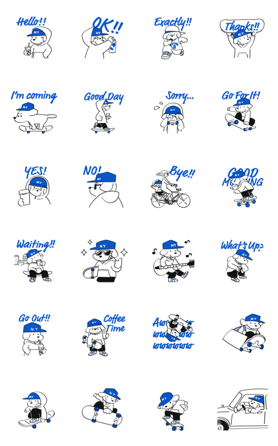 シバチャンのオリジナルキャラクター「スケータージョン」のアニメーションスタンプ。ジョンは犬でありながらスケボー、サーフィン、HIP-HOPが趣味のニューヨーカーです。