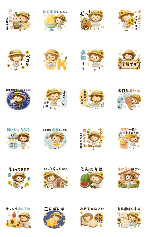可愛い3D麦わらガールの動く夏スタンプセットです。