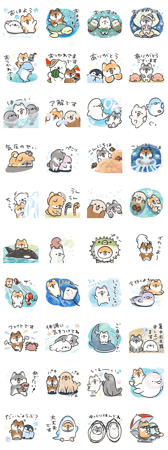 スタンプ説明 柴犬と水族館の海の生きものたちのスタンプです